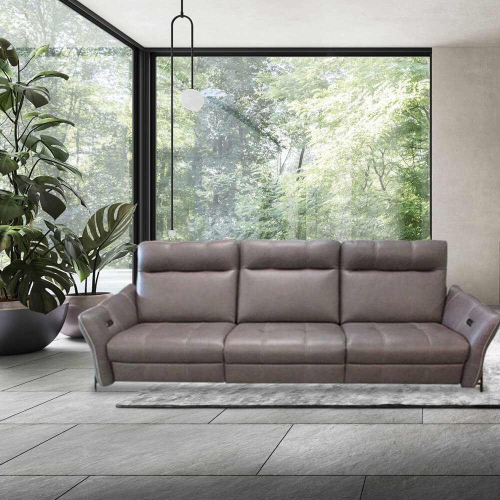 MISSORI一字型電動全牛皮沙發,結合咖啡色系的穩重與義大利工藝之美,支持椅背調整與挑高腳座設計,方便清潔且適合各年齡層,全方位提升生活品味與舒適度。